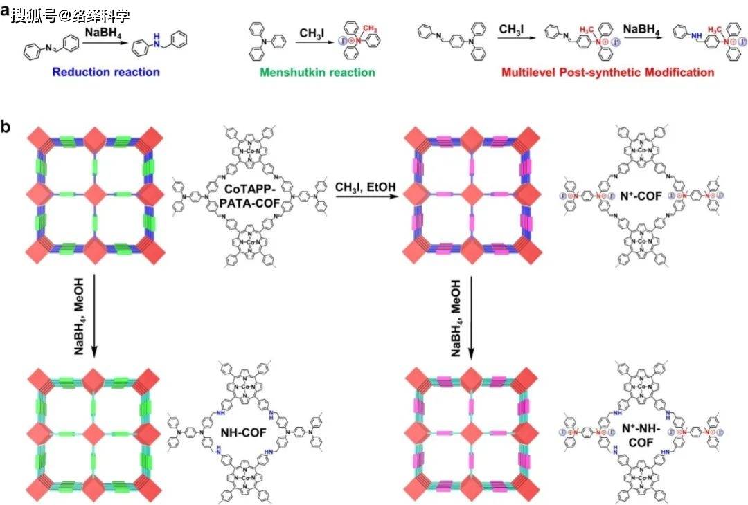 自下而上合成策略是直接构建功能性 COFs 的最常见方法。然而,受到空间位阻效应、溶解度差异和微观可逆性的限制,有些官能团不能通过自下而上的合成策略被直接引入至 COFs 中。作为替代型方法,合成后改性策略为在分子水平上构建具有可控催化性能的功能骨架、孔和键提供了一个极具前景的途径。因此,如果单一步骤还原和离子化的后改性策略能够良好集成,则有望获得具有还原亚胺键和离子骨架的 COF 材料。然而,该方面的研究目前仍然较少。