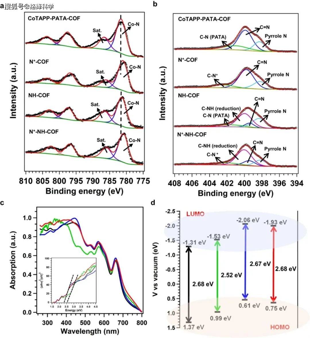 CoTAPP-PATA-COF,N+-COF,NH-COF 和 N+-NH-COF 中的 Co 含量分别为 4.0,4.0,3.7 和 3.7 wt.%,与 ICP 测试结果一致(分别为 3.6,3.5,3.3 和 3.1wt.%)。此外,四组 COFs 的高分辨率 CO 2p XPS 谱均显示出 Co-N 配位,证实多级改性后 Co-N 位点可以得到良好保留。