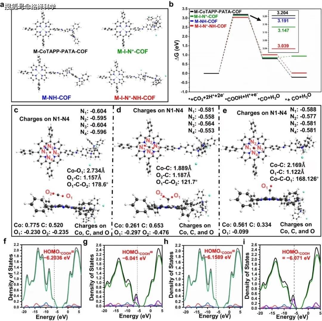 从热力学角度来看,M-I-N+-NH-COF 上 *COOH 的最低自由能变化与其最佳性能相一致。此外,M-I-N+-COF 和 M-I-N+-NH-COF 的 *COOH 自由能变化值(∆G)均低于 M-CoTAPP-PATA-COF 和 M-NH-COF,表明离子化的促进作用比中性更强。