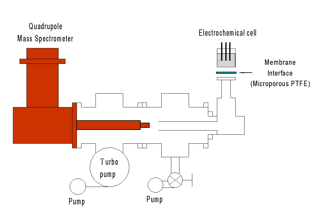 原位微分电化学质谱仪(电催化DEMS),其依靠真空压差作为动力,通过阻水透气膜(靠近工作电极或与多孔工作电极紧密接触)将电极表面电极反应产生的气体或挥发性产物在毫秒时间内,抽取到质谱仪中,从而能够高灵敏度、高时间分辨率地检测到产物或中间产物。
