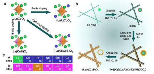 研究人员以碳包覆的碲(Te)纳米线作为模板,通过水热过程及后续退火处理,合成了具有多孔结构的LaCoO3纳米管材料(图1)。进一步对LaCoO3进行A位点掺杂(A位点包括Ce、Pr、Nd、Sm或Gd),B位点掺杂(B位点包括Mn、Fe、Ni、Cu或Zn),及A/B位点双掺杂(A/B位点包括Pr/Ni或Sm/Ni),实现了多达13种钙钛矿氧化物纳米管材料的通用合成。系列钛矿氧化物纳米管材料具有高的BET比表面积,为30~48 m2/g,远远大于通过传统固相方法合成的钙钛矿材料(6 m2/g),以及大多数文献报道的钙钛矿材料。通过多重表征手段,确定了元素的均匀掺杂。态密度计算结果表明,掺杂可以带来LaCoO3电子结构的变化,有助于调节OER过程对反应中间体的吸附。